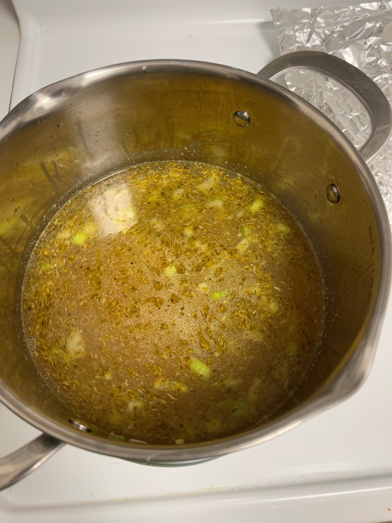 Once the vegetables are softened, add the broth, thyme, and oregano and bring to a boil. About 5-7 minutes.