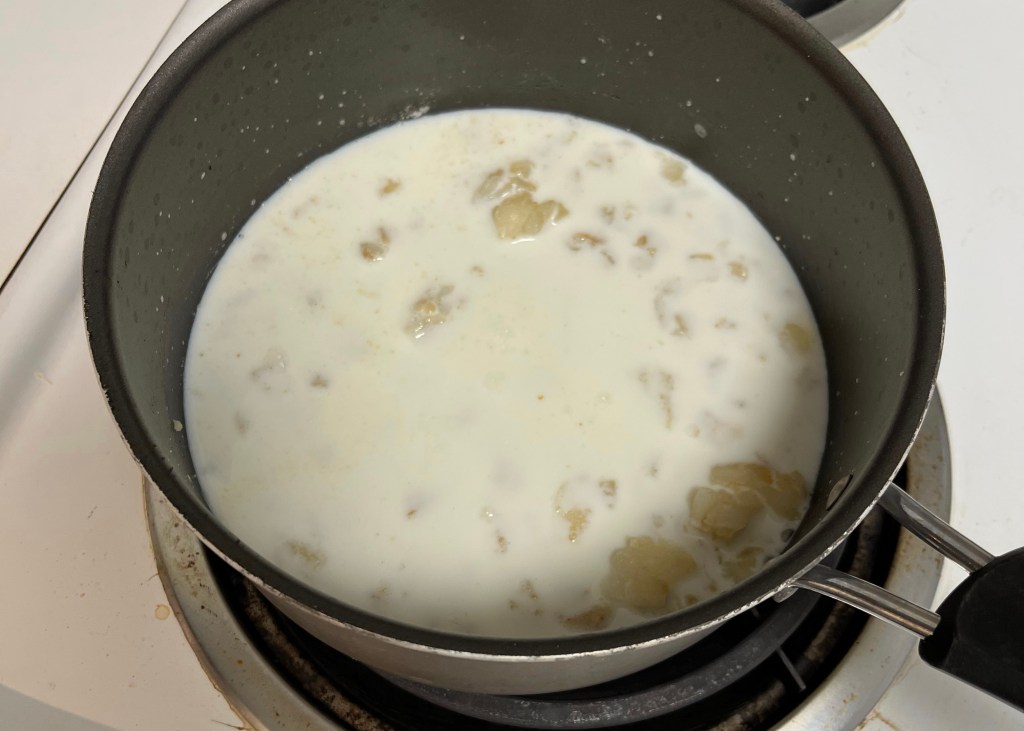 Next you’ll want to add milk. I added a little over 1/3 a cup, and then let it boil. Boiled milk looks pretty weird in my opinion. very frothy.