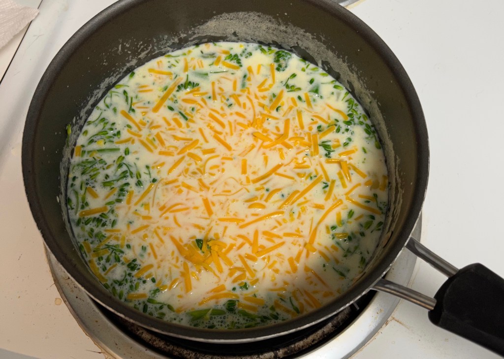 Next you’ll want to get your Velveeta, broccoli, and cheddar cheese shredding. I bought a pound of Velveeta, but used maybe an eighth of it, and stored the rest. Cook until the broccoli is softened.