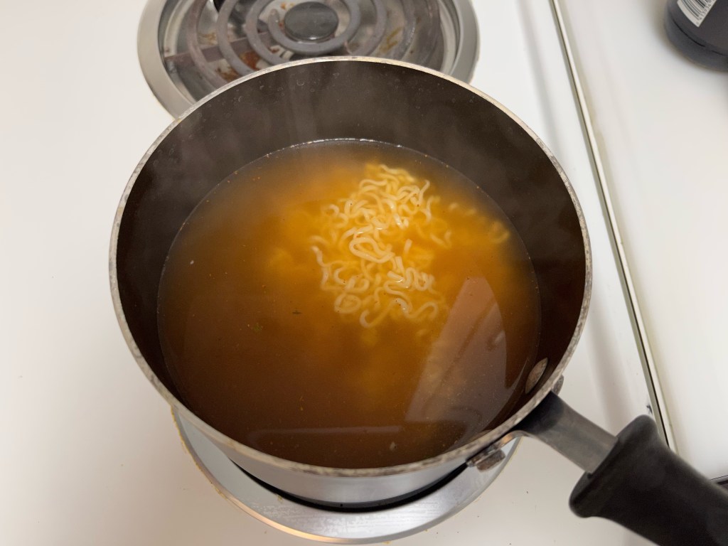 Take the soup off the heat and add the spices, soy sauce, and ramen packet
