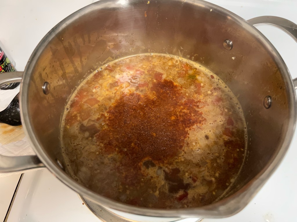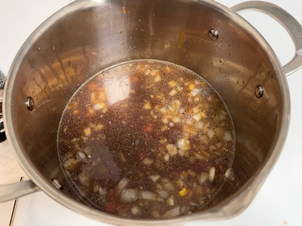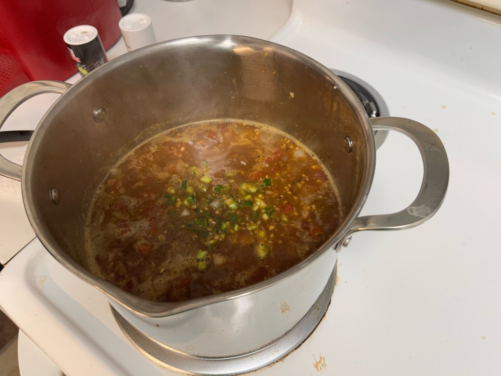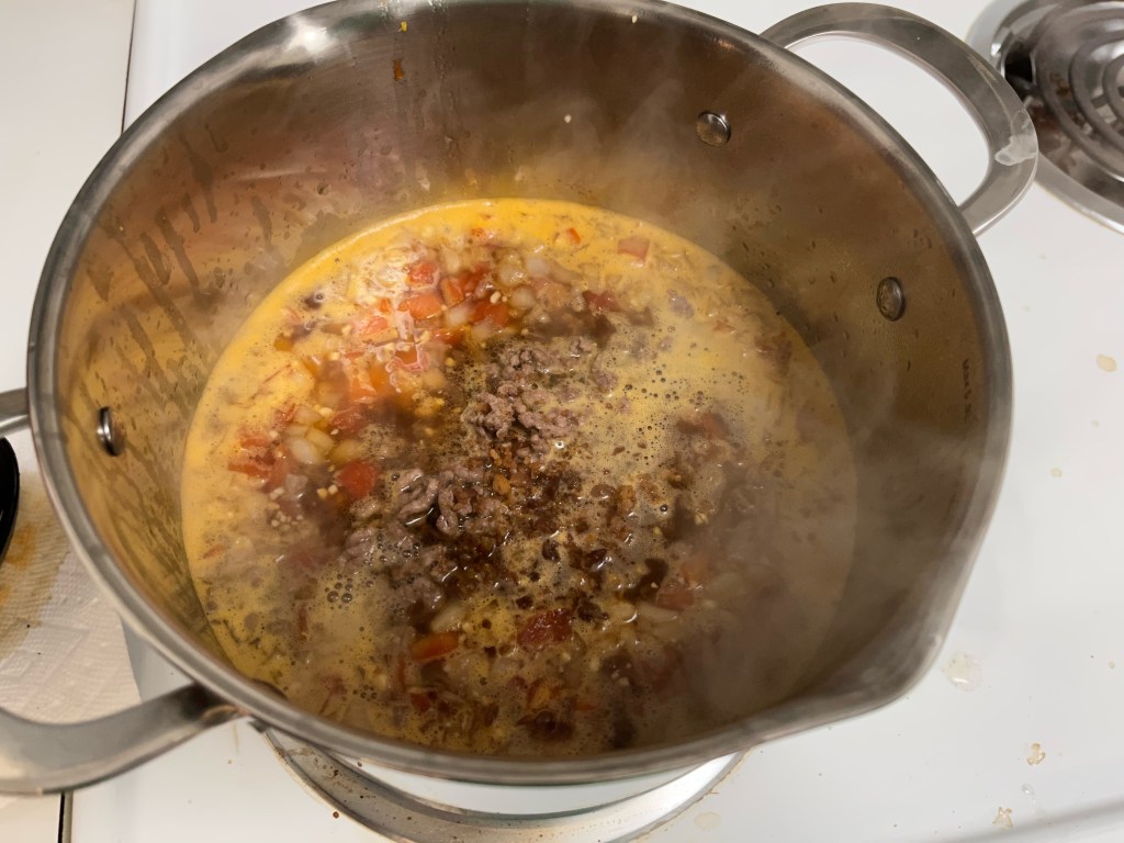 Once the soup has boiled for a bit, add in your meats: the hamburger and bacon