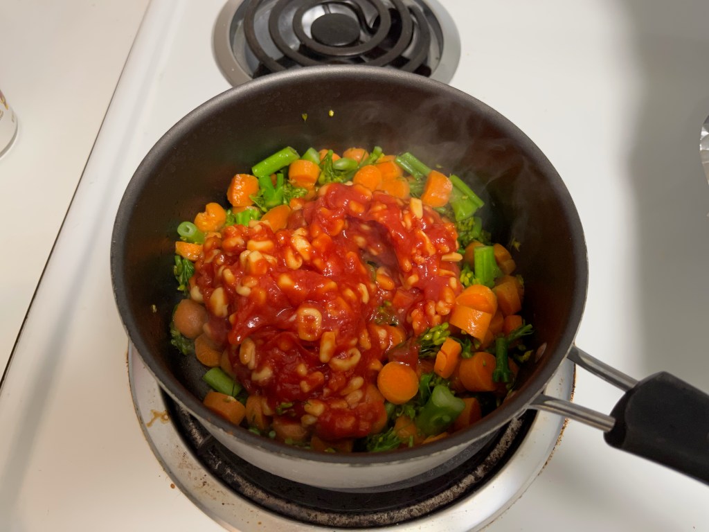 Get your can of alphabet soup open and pour into the saucepan
