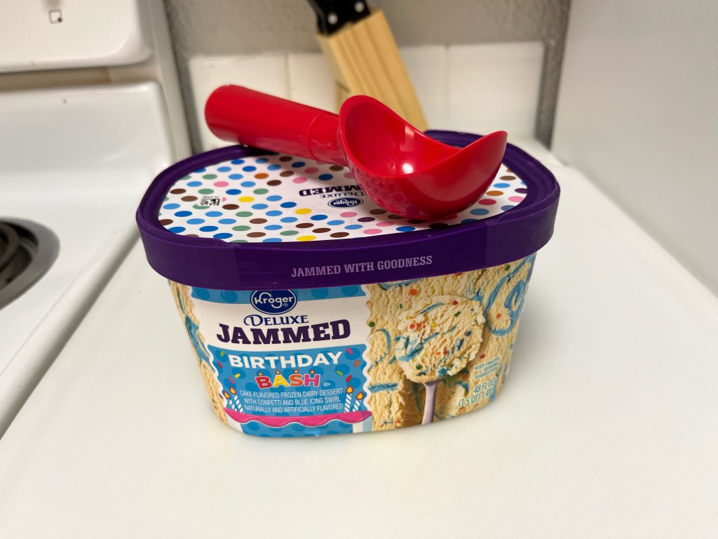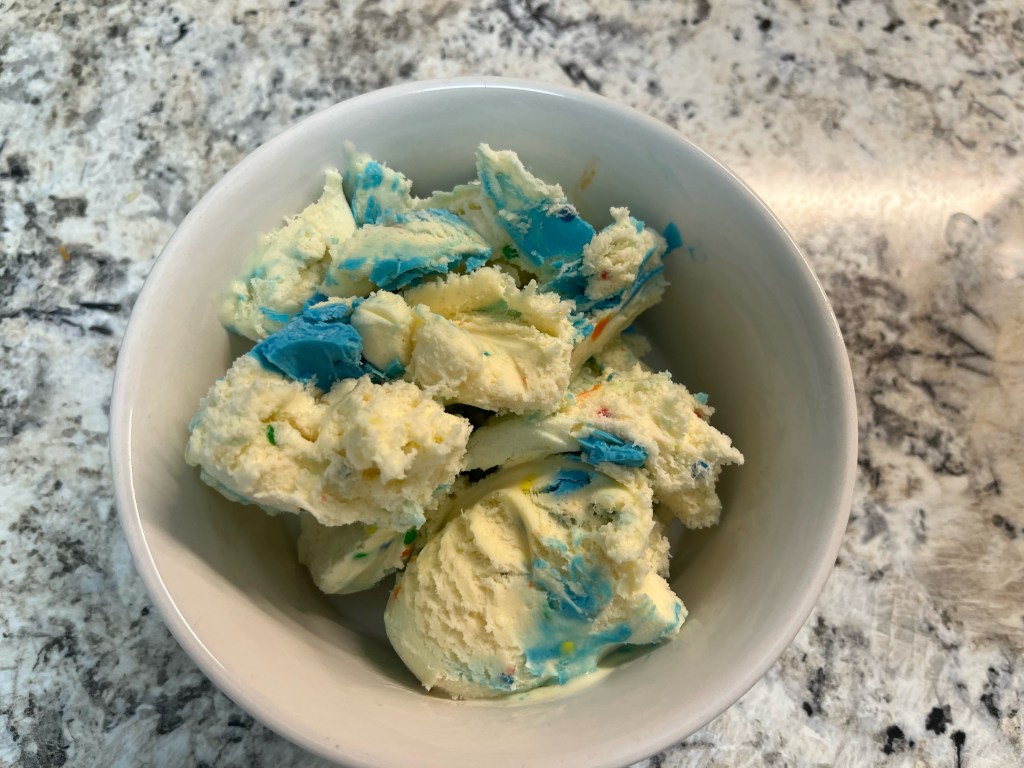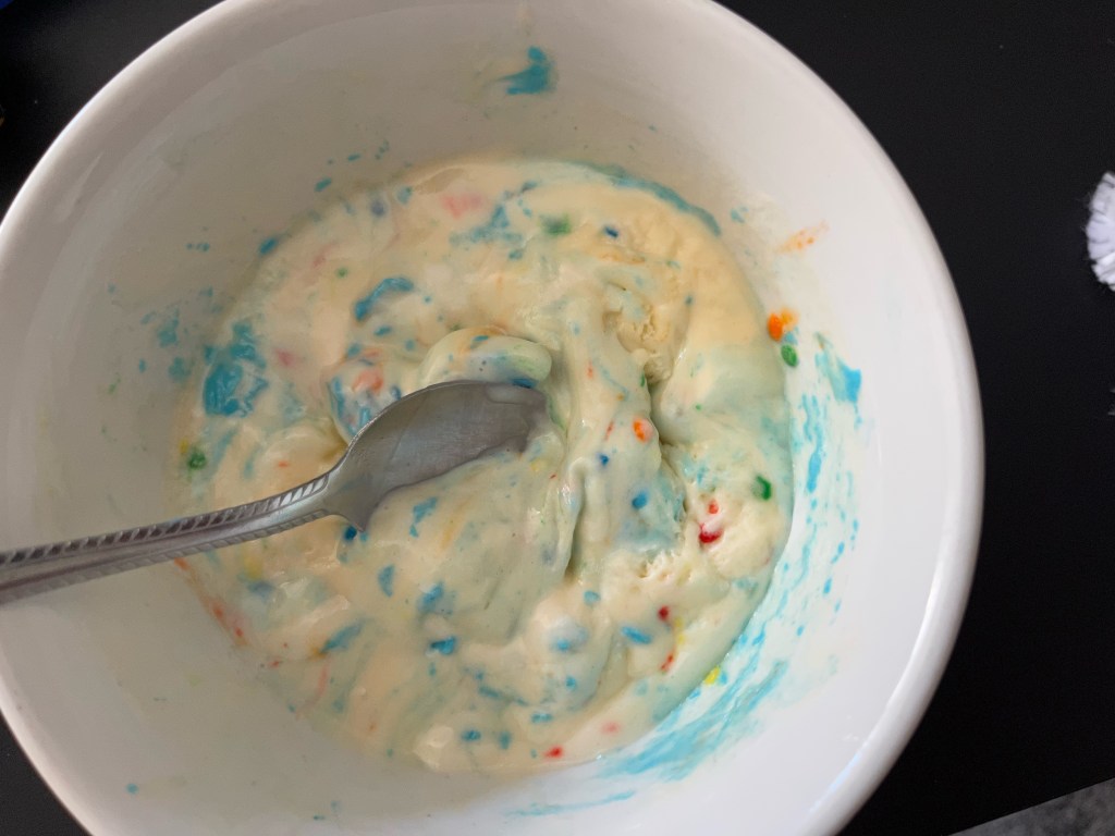 If you’re lucky enough to find the last carton of birthday cake ice cream like I was, you will first need to scoop some ice cream into your soup bowl