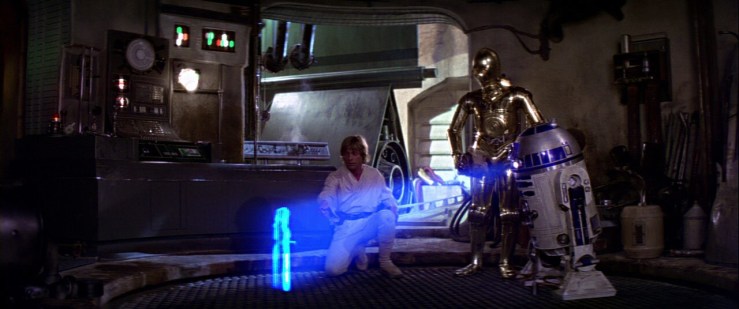 Luke Skywalker receives a video from Princess Leia saying she needs help. The message is intended for Obi-Wan Kenoi, who he happens to know