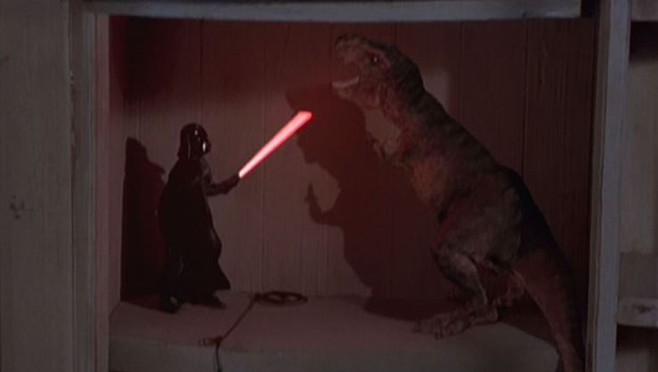 Thereโ€™s a small scene in the movie where the main character tests his magic cupboard by putting a lot of random toys in to see if they come to life, and Darth Vader is seen fighting a T-Rex.