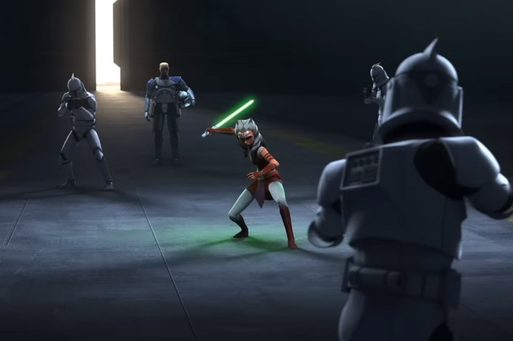 Back with Ahsoka this time and this episode is showing her training and Anakinโs teaching methods. She was displaying her lightsaber skills in a dojo against robots. Anakin was not impressed by it, thinking that itโs too predictable. He took her to a warehouse where some of his clone troopers were waiting, and he set up a test for her to block shots that they fired at her.