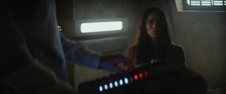 After a firefight with the Empire, theyโre found and captured by Sawโs crew and taken to him where Jyn finds a message from her father about the Death Star. She listens to it once, and then the Death Star shows up and destroys the city on Jedha.
