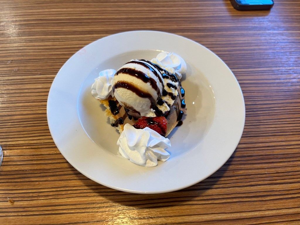 We got the Amy dessert at the end, and it was pretty good! Strawberries on a waffle with a scoop of ice cream was a good choice for dessert, and if I were to go back I think I’d try the Shadow chocolate pancakes for a dessert.