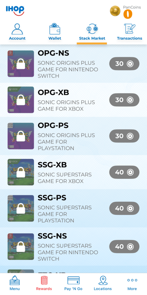 I already had all of these games, so this meant nothing to me. I didn’t come for them. I used my pancoins to buy the one thing unique to IHOP; Something that is completely unique to the restaurant and Sonic: