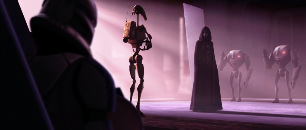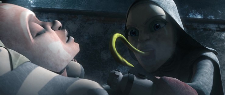 What makes this episode notable is when Anakin hears of his padawan’s distress, he goes to the prison cell they kept Poggle to get information on how to save her. The last interrogation with everyone in the room didn’t work, but we see for the first time in the show a darker side of Anakin, because he uses the force to choke the war prisoner, torturing him to get information.