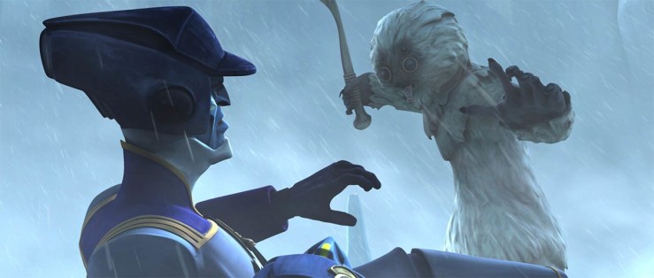 The bases created by the clones and the opposing Separatist army have both been destroyed by an unknown third party, so they need to investigate what happened. It turns out that the ice moon in inhabited by some humanoid spider-people, and the chairman of the planet orders the jedi and clones to start a war with the natives to remove them from the moon they “own”