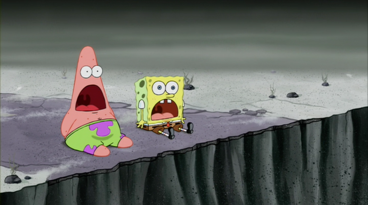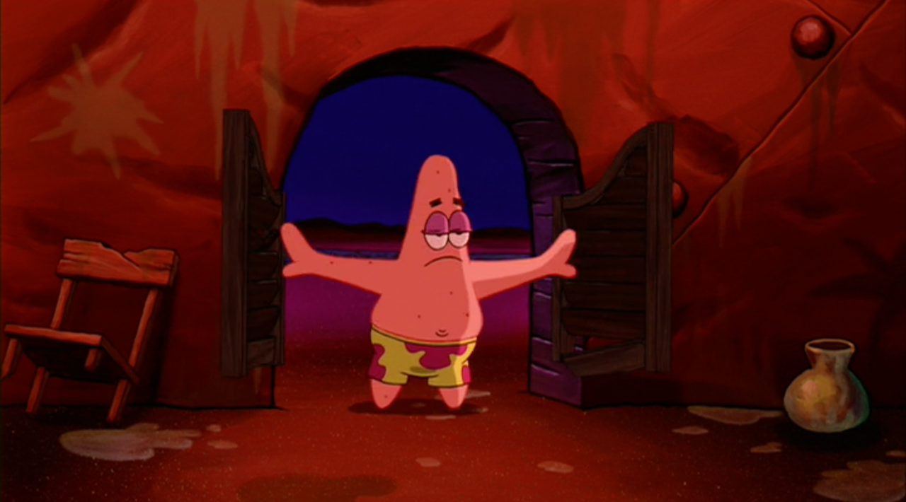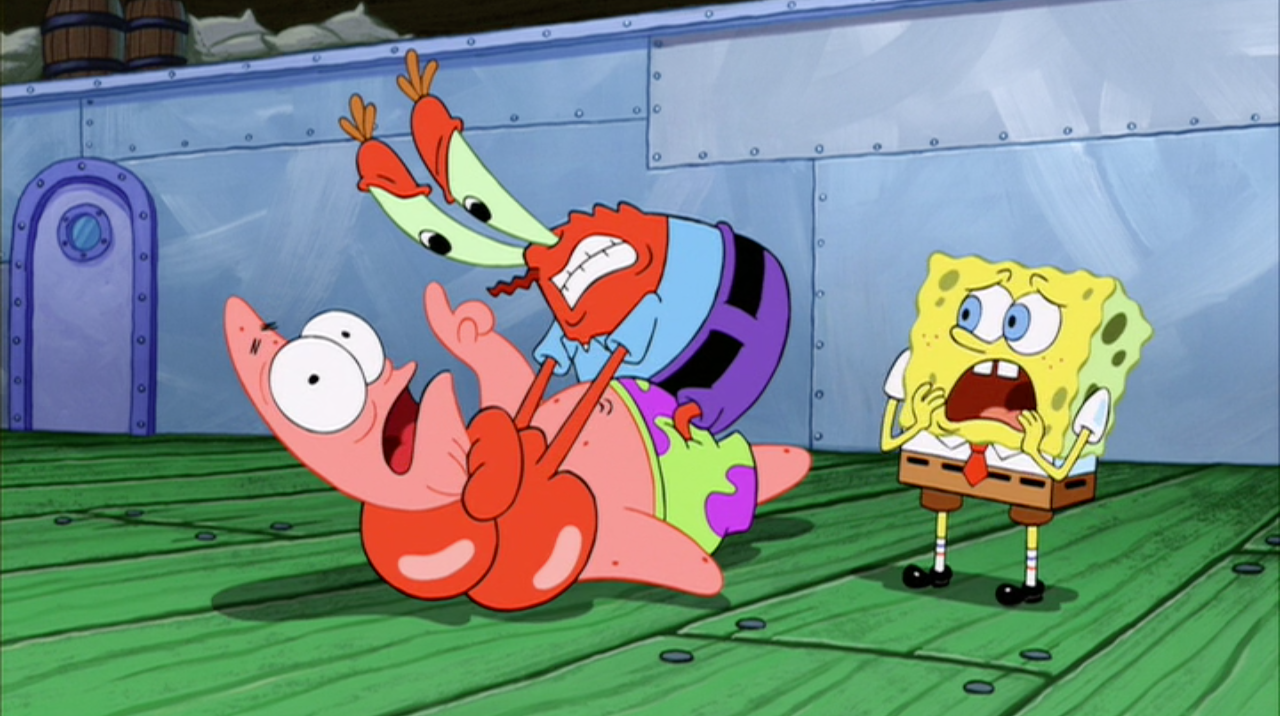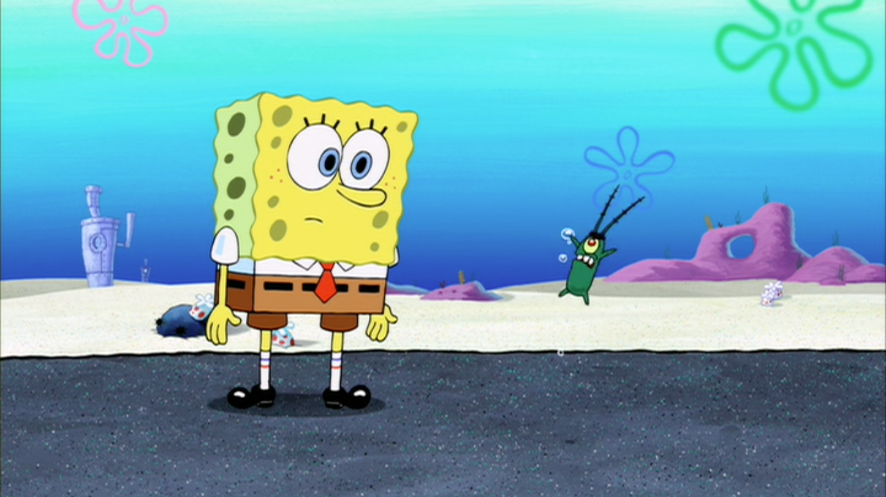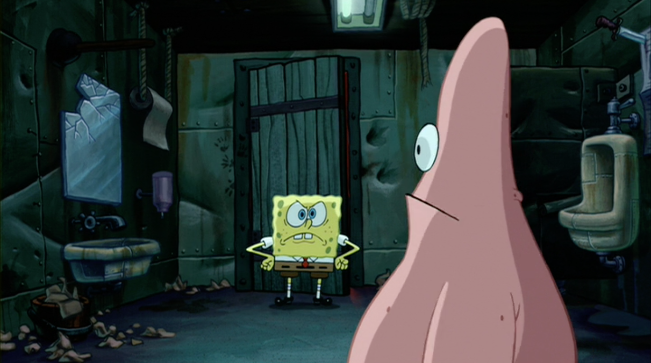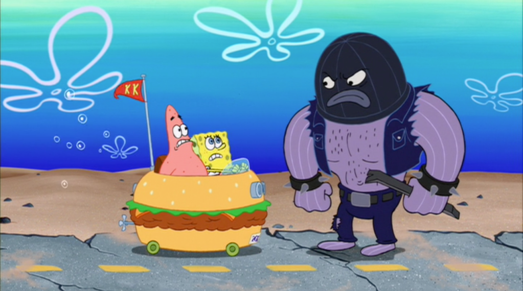 Spongebob hasn’t really been beyond Bikini Bottom before the events of this movie, so when he had to go get the car back from a really tough guy, he decided not to confront him and instead get a distraction from Patrick. That failed and Spongebob briefly argues with him.
