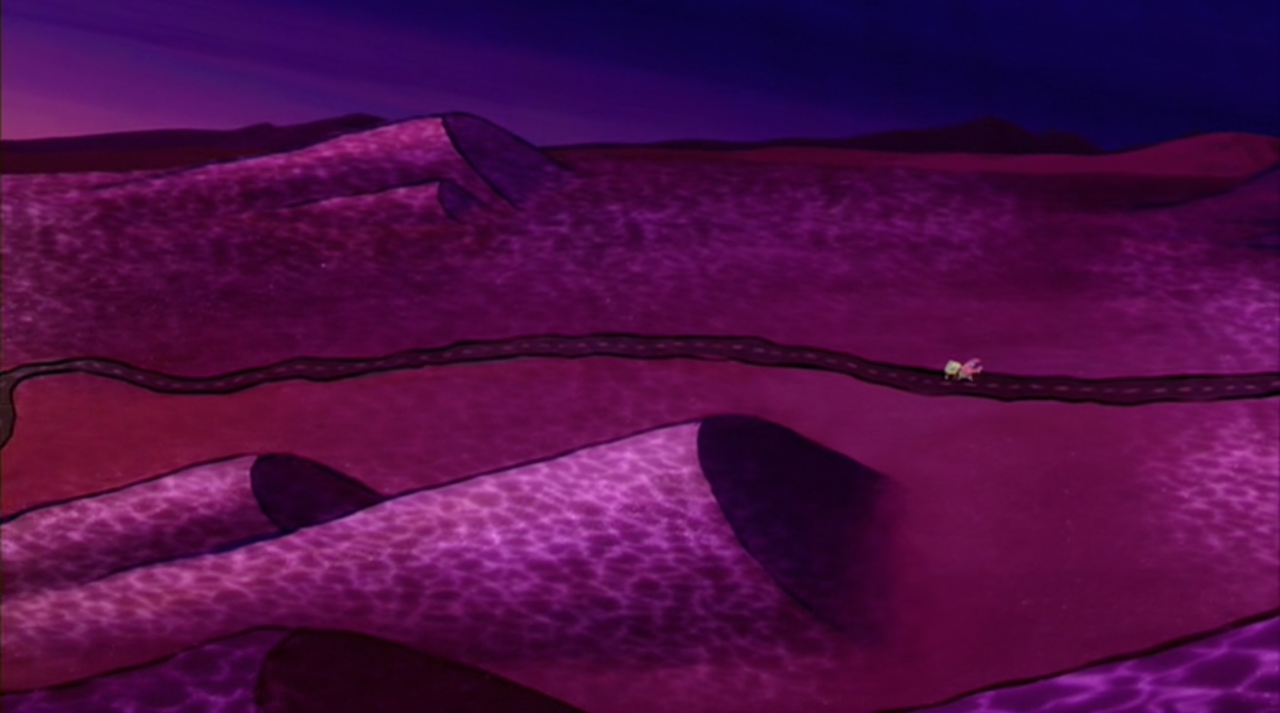 The idea where the wild, open land as a character fits in the Spongebob movie by attacking the characters every step of the way to Shell City. Even the two gas station attendees mention it by stating “You two dipsticks ain’t gonna last 10 seconds over the county line!” They lasted 12 seconds before a big tough guy stole their car.
