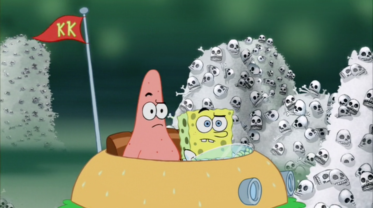 Other moments of the harsh, hostile, and wide open landscape being a trouble for our heroes was when a frogfish pretended to be a sweet old lady selling ice cream, and then the frogfish revealed itself as it attempted to eat Spongebob and Patrick, chasing them for miles until they had to drive the car off a cliff.
