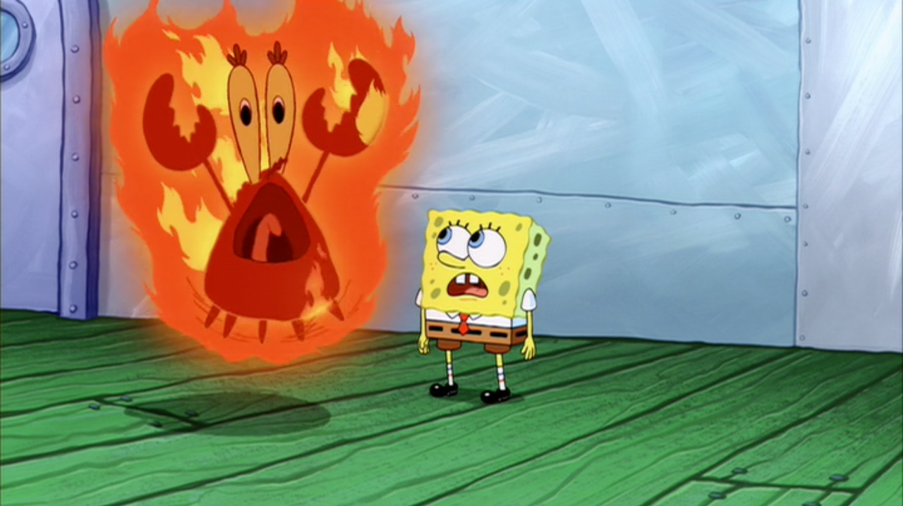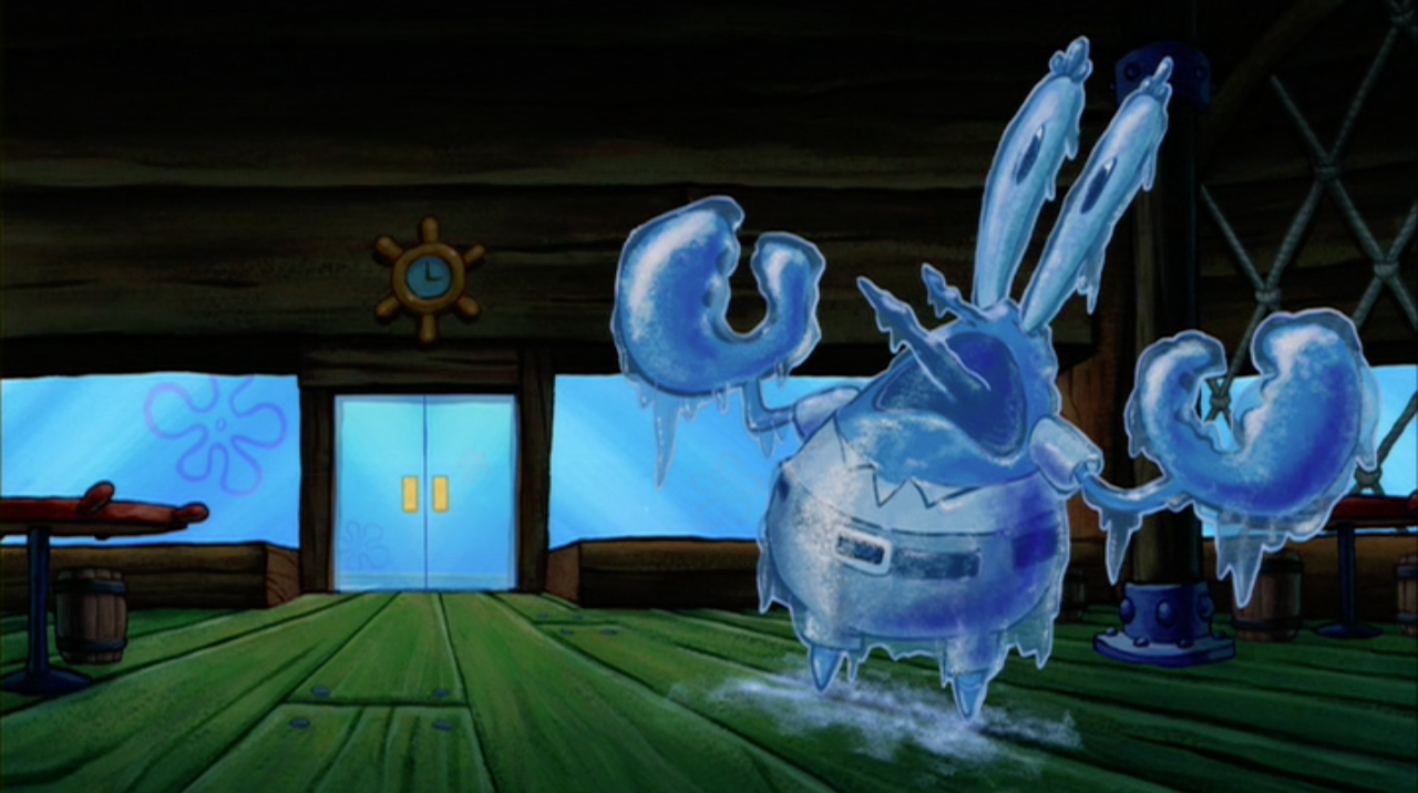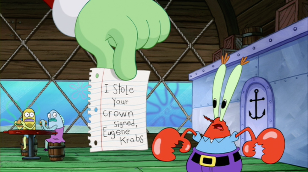 When King Neptune’s crown was stolen, Mr Krabs was framed by Plankton and Neptune was going to fry Mr Krabs. Spongebob made a deal that he would go on a quest to retrieve it. King Neptune originally gave Spongebob 10 days but Patrick negotiated it down to six, and if they failed then Mr Krabs would burn.
