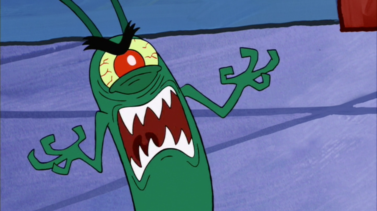 Plankton: No, I am not on my way over [mocks SpongeBob] to the grand-opening ceremony. [Jumps four times] I’m busy planning to rule the world! [Chuckles]